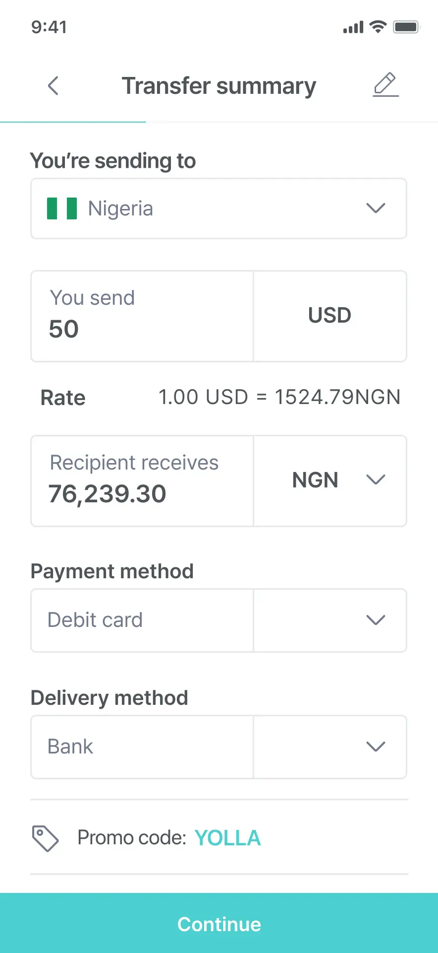 Use promo code “YOLLA” to send your first 3 transfers with no fees. The promo is valid for 90 days after your first transfer.